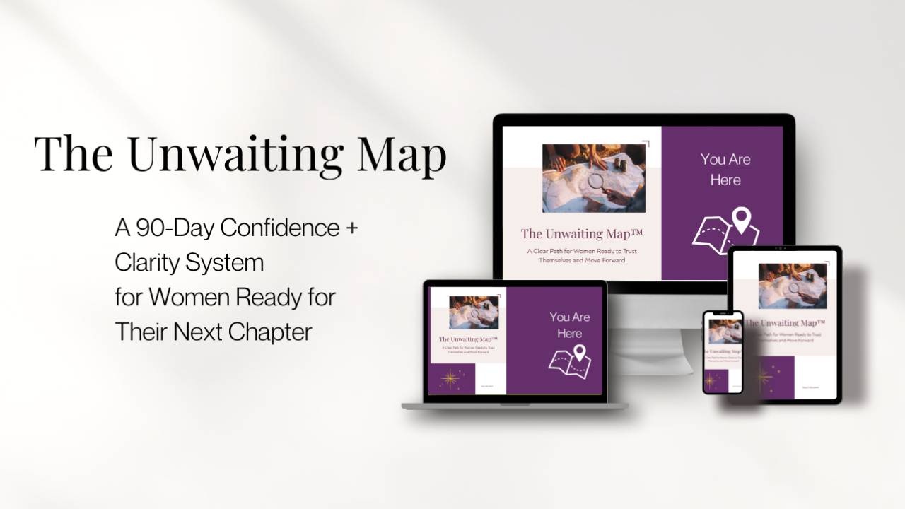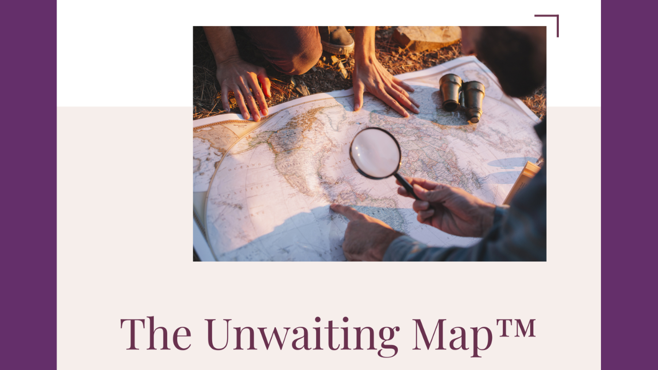 The Unwaiting Map™ is a structured, self-coaching system built from the same framework I use with my private coaching clients. It gives you the tools, practices, and reflection prompts to move through three things that most programs skip entirely: